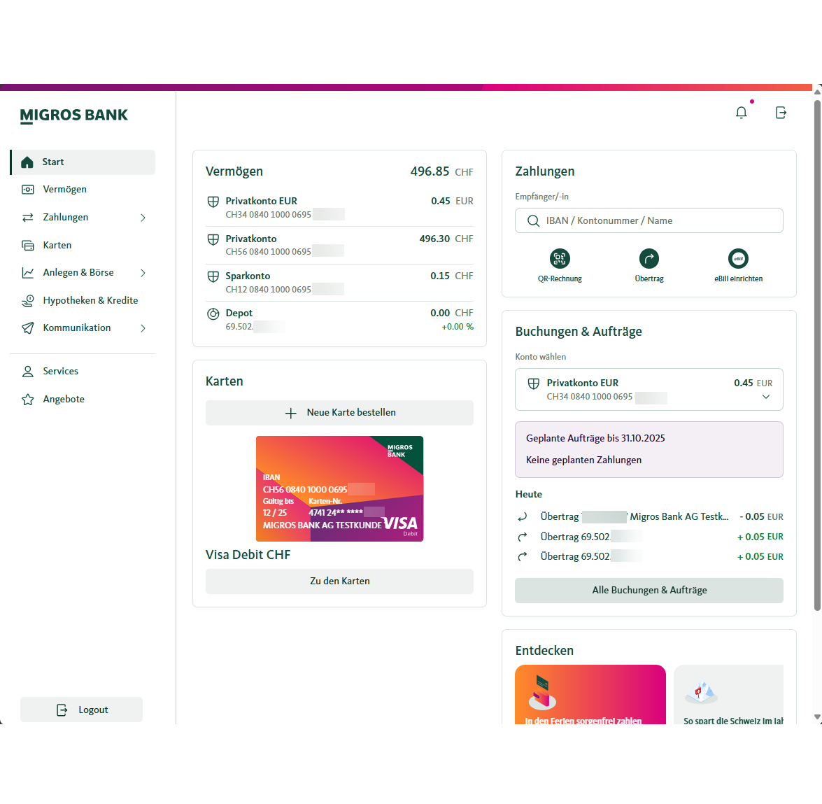 Erstellen Sie einen Saldierungsauftrag im E-Banking, um Konten zu saldieren. Wählen Sie in Ihrem E-Banking im Menü «Services», dann «Meine Konten», dann «Konten verwalten».