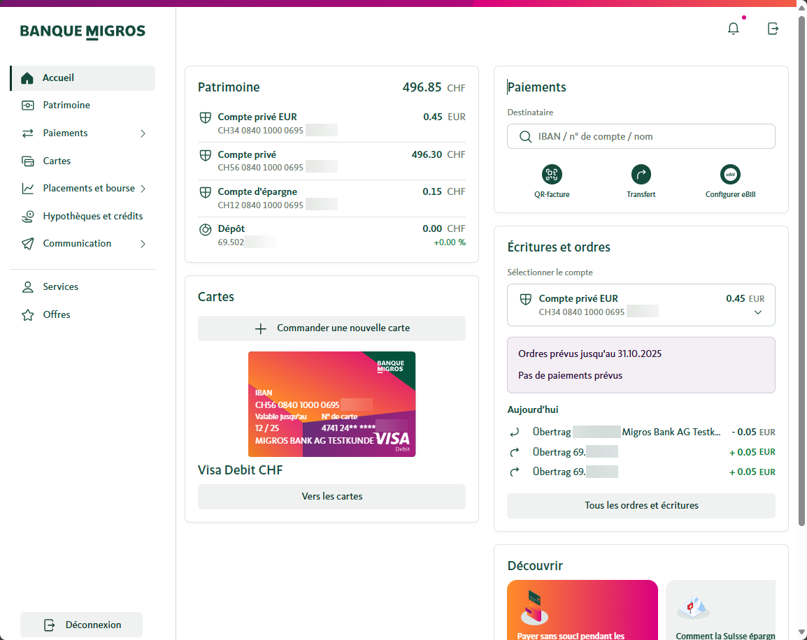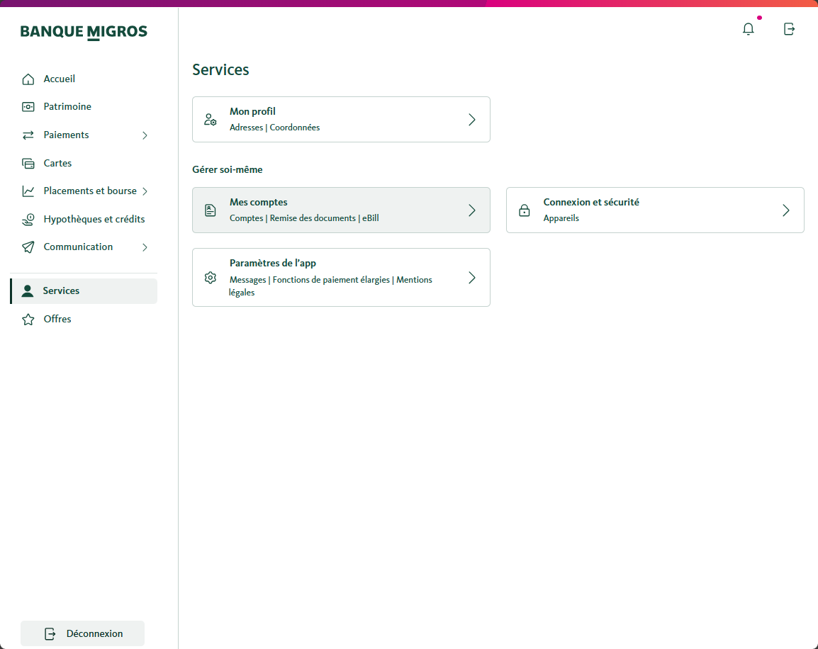 Créez un ordre de clôture dans l'e-banking afin de clôturer des comptes. Allez dans l'e-banking et, dans le menu «Services», sélectionnez «Mes comptes», puis «Gérer les comptes».